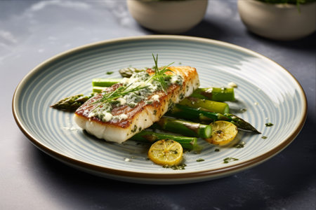 Nordic Delight: Exquisite Close-Up of Modern Style Traditional Fried Skrei Cod Fish Steak with Green Asparagus and Potatoes