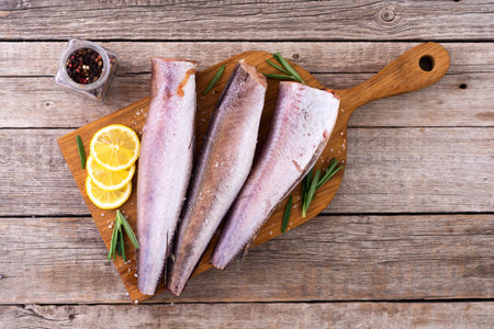 Fresh catch fish rasp three pieces on wooden table. Food ingredient with copy space