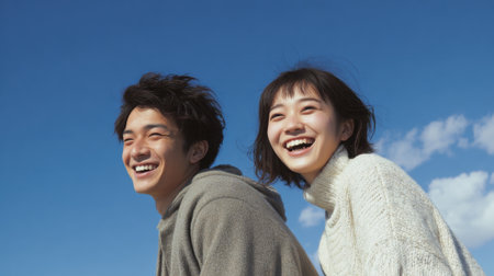 Bright sunny day by the ocean, two young people are sitting closely, laughing and enjoying each other's company under a clear blue sky.