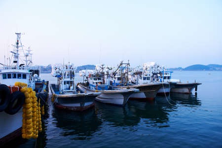 Tongyeong, Korea - October 24, 2021 : Panoramic view of Gangguan port Dongpirang village at sunset
