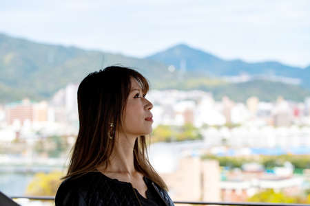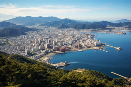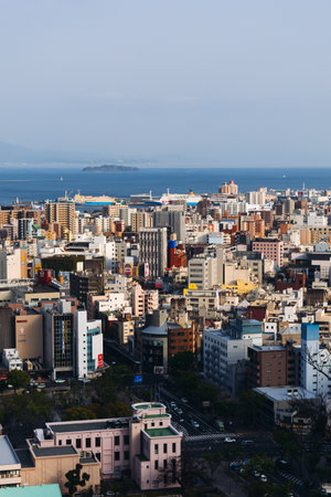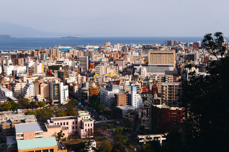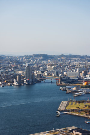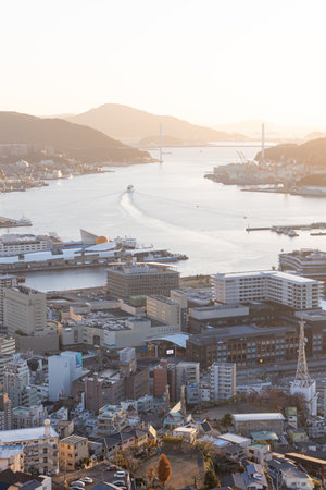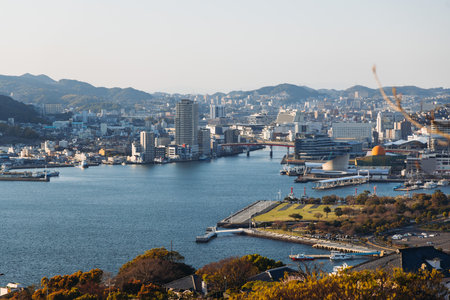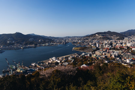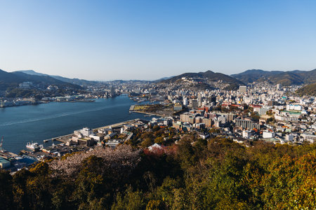 Nagasaki panorama, Japan, beautiful aerial view, with city skyline, port and mountains, seen from Nabekammuri mount, in a spring sunny day with a blue sky, Nagasaki prefecture, Kyushu island region