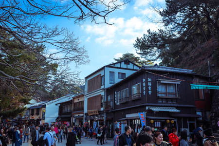 Miyajima, Japan - January 02, 2020: Cityscape to the Walking Tourists and Itsukushima streets