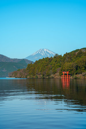 beautiful autumn scene of mountain Fuji, Lake Ashinoko and red Torii gate, Hakone, Japan