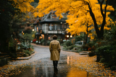 A person in a beige coat strolls down a cobblestone village street, surrounded by vibrant yellow autumn leaves and charming historic architecture, evoking a sense of tranquility and nostalgia. Generative AI