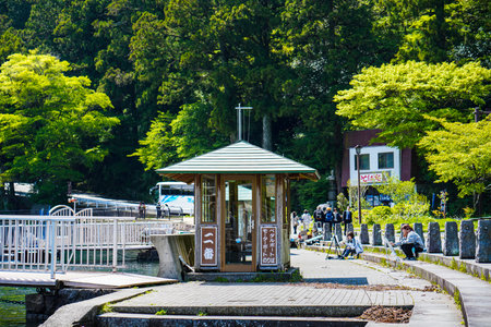Hakone, Japan - Dec 9, 2023: Peaceful morning along the waterfront promenade in Moto-Hakone, overlooking Lake Ashi and sunlit mountains with village buildings.