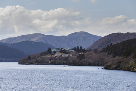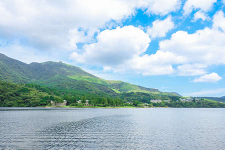 View of the landscape at lake Ashi in Hakone, Japan. Copy space for text