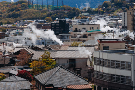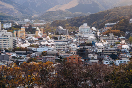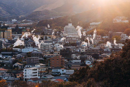 Beppu, Japan, city panorama skyline, Kannawa onsen distict, Oita prefecture, Kyushu island region,, Yukemuri observation deck, rising hot steam from onsen ryokan bath houses, Beppu resort hot springs