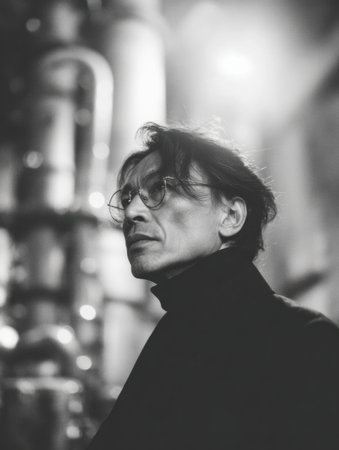 A man with glasses and disheveled hair gazes thoughtfully in an industrial location at night, surrounded by machinery and soft lighting.