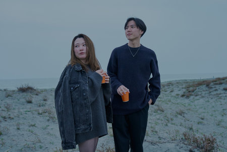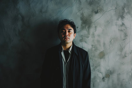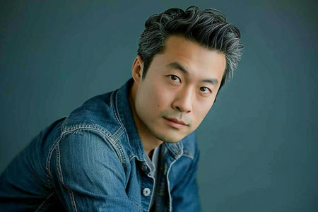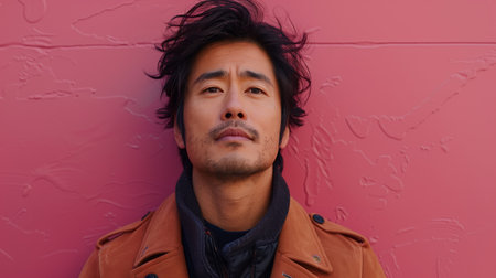 Charismatic Asian man in stylish outfit and haircut stands by a bright orange wall.