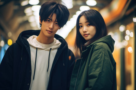 Fashion, trendy and portrait of Japanese couple in city for streetwear, genz style and summer. Date, urban and love with asian man and woman and outdoors for bonding, casual and cool together