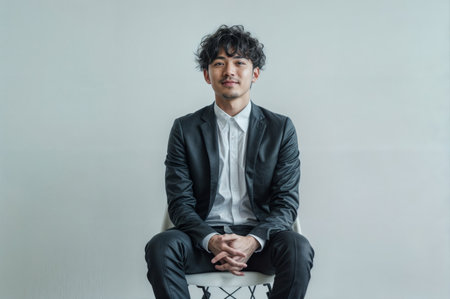A young man in a suit poses confidently while sitting on a chair, exuding professionalism and readiness in a minimalist setting.