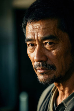 An elderly man displays a thoughtful expression as he gazes upward against a striking blue background. This portrait captures emotions of contemplation and wisdom.