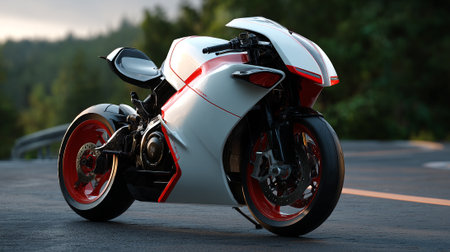 Sleek white s motorcycle with red accents parked on a scenic road.