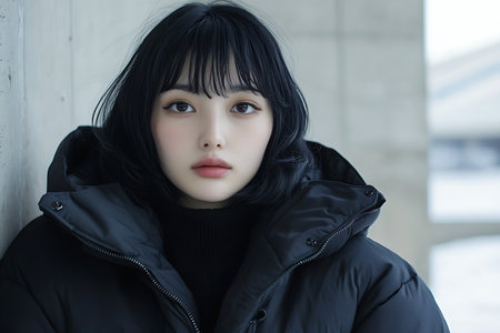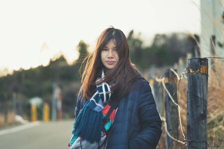 Beautiful Woman portrait in winter fashion clothing on the rural street in Japan