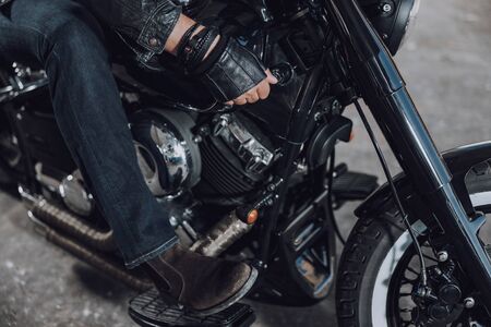 Cropped photo of Caucasian motorcyclist in leather clothes having rest in garage stock photo