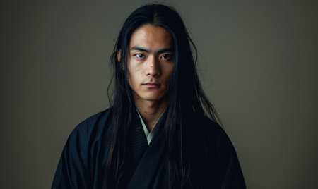 Portrait of young Asian man with dark long hair in traditional clothes looking at camera
