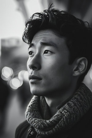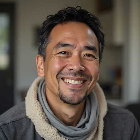 Portrait of a smiling Asian man wearing scarf and looking at camera
