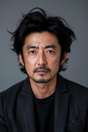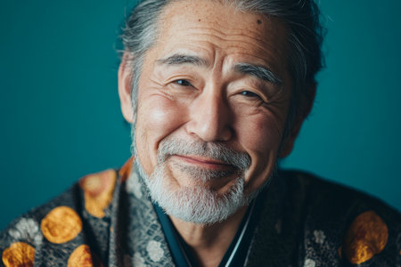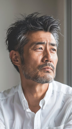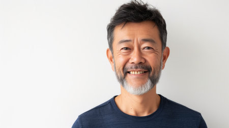 Stunning mid aged mature Japanese man with a gentle smile, looking at the camera, isolated on white background.