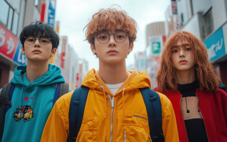 Three stylish young adults in vibrant jackets and glasses pose on an urban street.