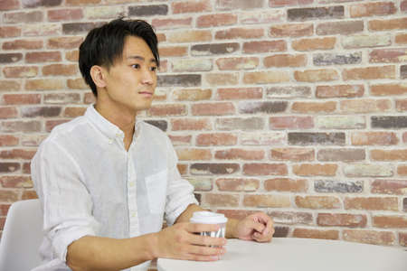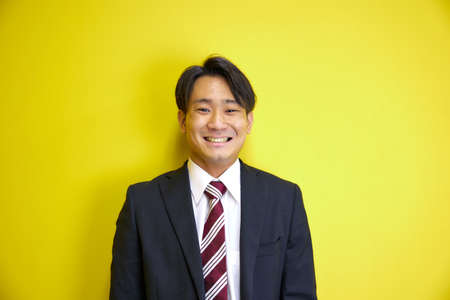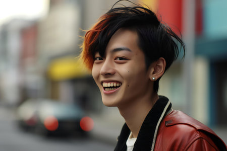 Portrait of a Japanese man with short spiky hair, dark red hair color