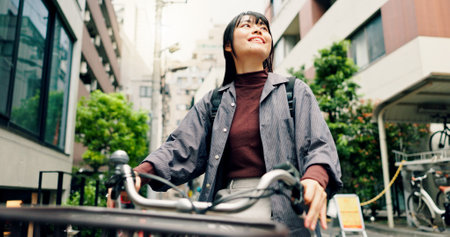 Travel, thinking and Asian woman with bicycle in city for morning commute, adventure and journey. Location, cycling and person on bike for explore, sustainable and eco friendly transport in Japan