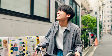 Travel, happy and Asian man with bicycle in city for morning commute, adventure and journey outdoors. Location, cycling and person on bike for trip, sustainable and eco friendly transport in Japan