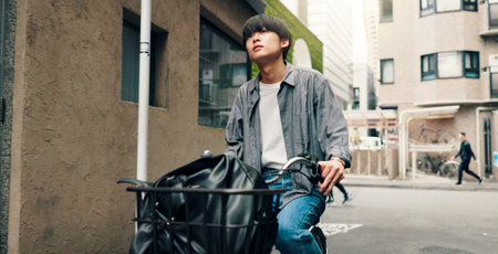 Travel, thinking and Asian man with bicycle in city for morning commute, adventure and journey outdoors. Location, cycling and person on bike for trip, sustainable and eco friendly transport in Japan