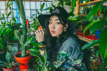 Stylish Young Woman Posing in Greenhouse Surrounded by Exotic Plants, Wearing Casual Fashion AI Generative