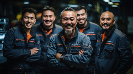 Successful mechanics working in a group perform repairs and upkeep in the garage.