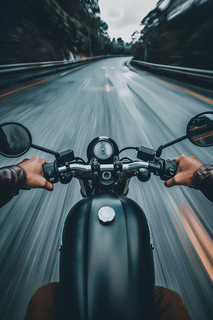 Closeup of two hands on motorcycle handlebars, motorcyclist on paved road.