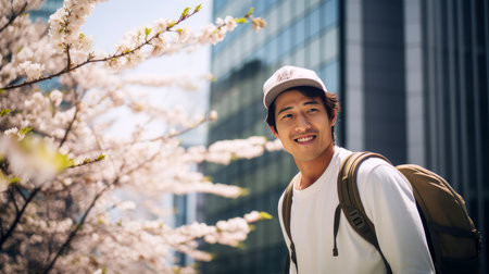 Modern happy young smiling Asian man guy tourist on the background of pink cherry blossoms and metropolis city. Businessman, spring blossoms, happiness joy dreaming love, Mental health, psychological treatment concept, positive thinking, good thoughts