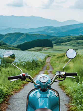 Blue scooter parked on winding road surrounded by green plants and rolling hills. Perfect scenery for travel agency and tours. Peaceful countryside with mountains in distance.