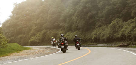 Three bikers riding big bike motorcycle touring on Inthanon National Park, Thailand.