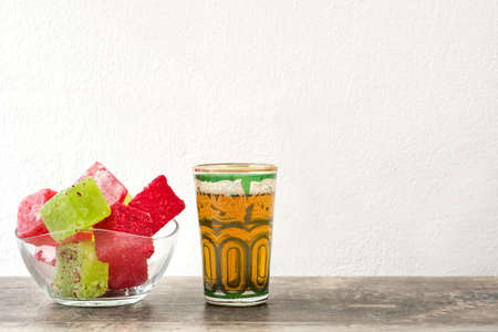 Turkish coffee, baklava and Turkish delight on the table. Photo toned and shallow depth of field