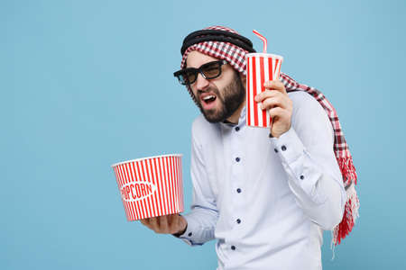 Scared arabian muslim man in keffiyeh kafiya ring igal agal 3d glasses isolated on pastel blue background. People religious concept. Watching movie film, holding bucket of popcorn, cup of soda.