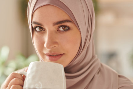 Attractive Muslim woman wearing pale pink hijab on head holding cup of coffee looking at camera, horizontal close-up portrait