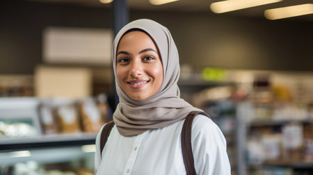 Smiling young female with hijab in supermarket worker looking at the camera.