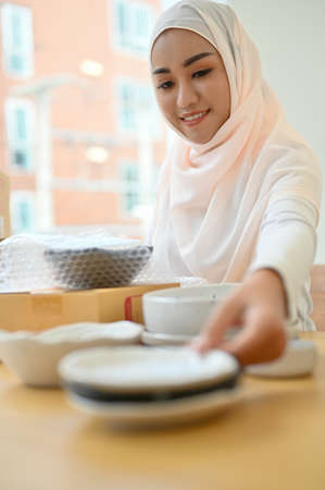 Portrait of a beautiful asian muslim woman small business owner preparing customer order, packing a kitchenware product into a shipping box.