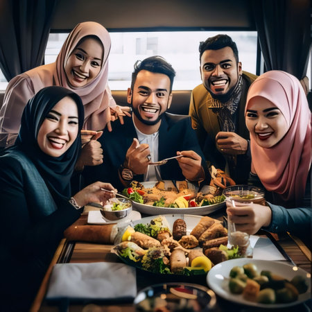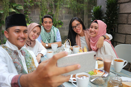 Group of young muslim taking selfie at dining table during ramadan celebration, break fasting time.