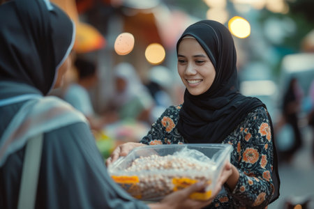 A woman wearing a hijab holds a bowl of food in her hands, ready to serve and eat, A woman handing out charity during Ramadan, AI Generated