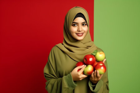 A woman in a hijab holding a plate of food. Generative AI image.