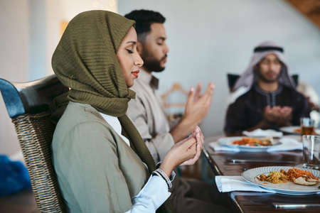 Giving thanks for a bountiful feast. Shot of a muslim family praying before they break their fast.