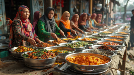 A row of women serves a variety of traditional dishes at an outdoor market. The image captures vibrant colors, cultural diversity, and a sense of community and togetherness.
