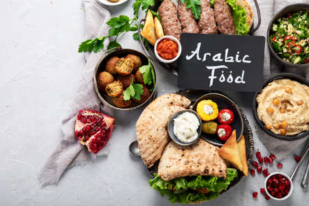 Arabic and Middle Eastern food, dinner table. Meat kebab, hummus, tabbouleh salad, traditional sauces, olives, pita, dates fruits, nuts, pomegranate. Set of Arabian meal, top view, banner.