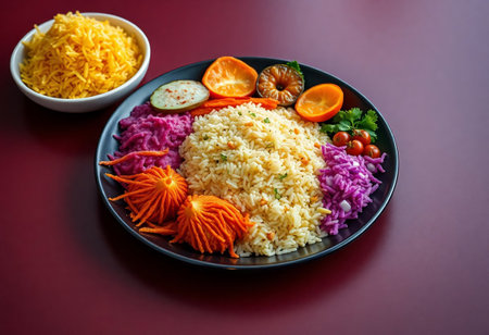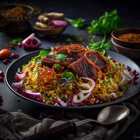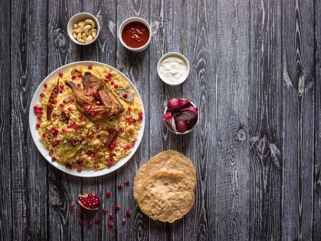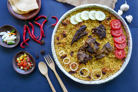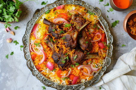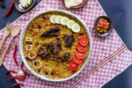 Traditional Kebuli Rice with Lamb, aromatic spiced rice dish cuisine, served with tender meat, raisins, cucumber, onion, seasoning and fresh tomato slices