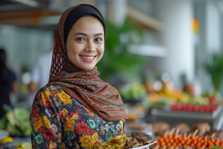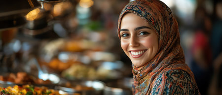 A smiling woman in a colorful hijab enjoys a cultural feast, surrounded by a diverse array of rich and vibrant dishes