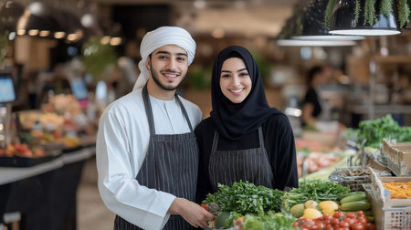A smiling Arab couple stands together in a grocery store, surrounded by fresh produce.