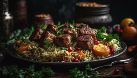 Traditional oriental pilaf with meat, rice and vegetables on dark background. AI Generated