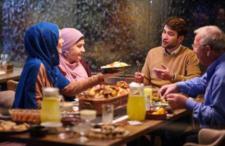 Muslim family enjoys iftar in restaurant with Ramadan decorations and warm indoor lighting