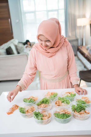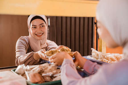 a girl in a veil give a plastic tray of takjil food to seller at a roadside stall